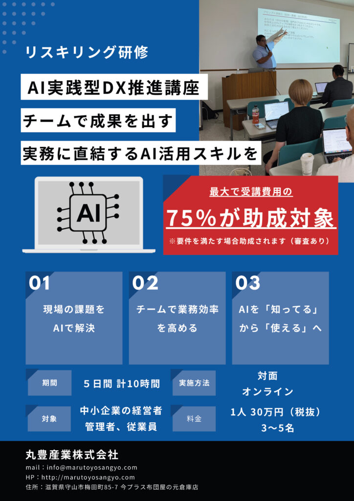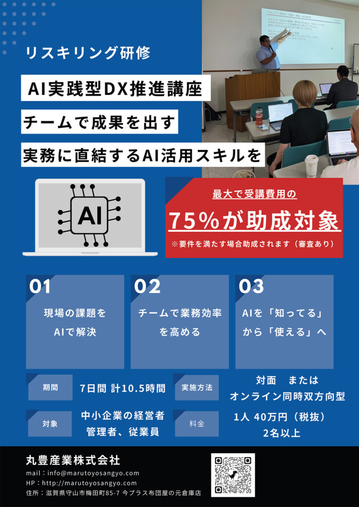 中小企業のDXを推進するAIリスキリング研修。実務直結のスキル で、チーム全体の業務効率を高めます 。GeminiやChatGPTを学び、AIを「使える」組織へ。